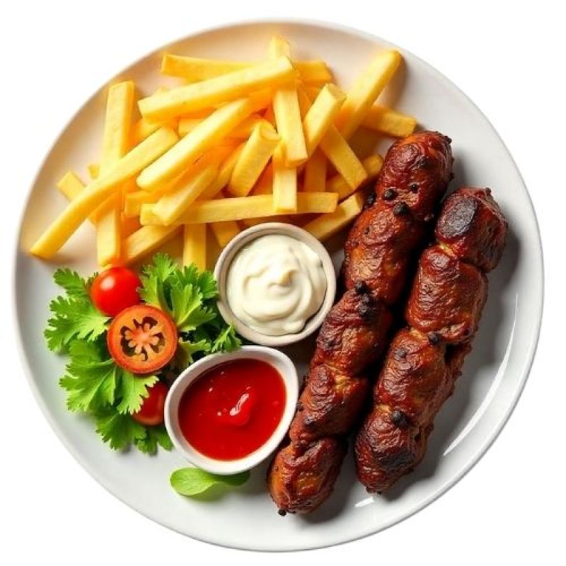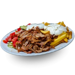 Döner, Adana-, Lamm-, Hähnchenspieße, reis oder Pommes und Salat.