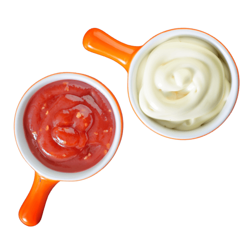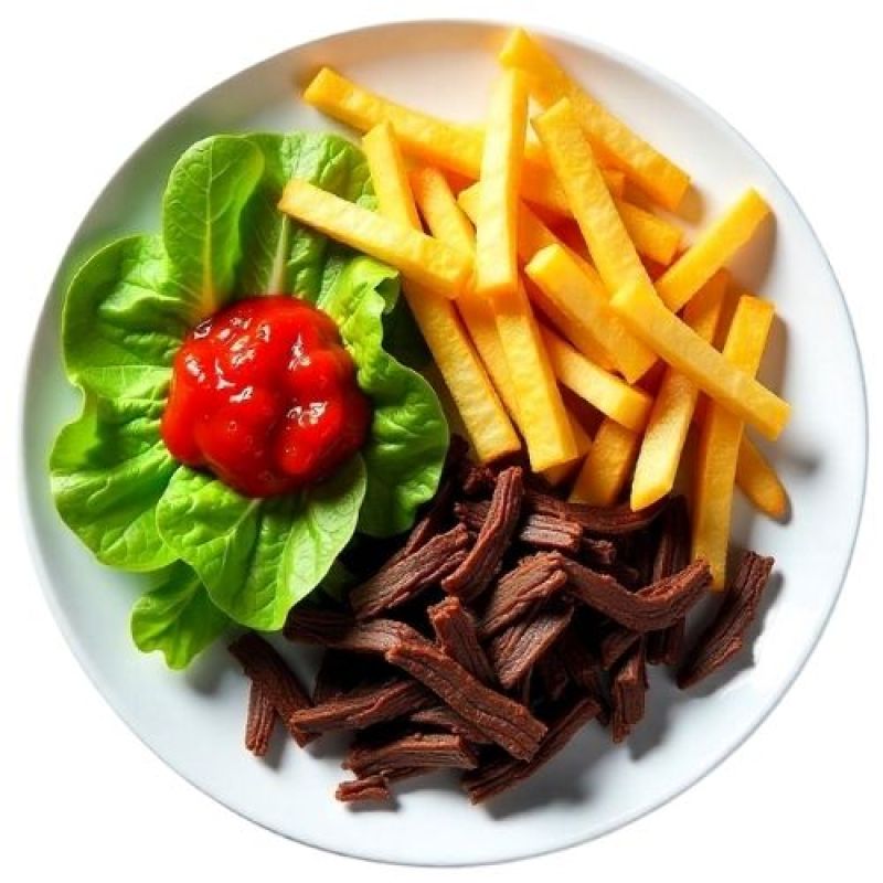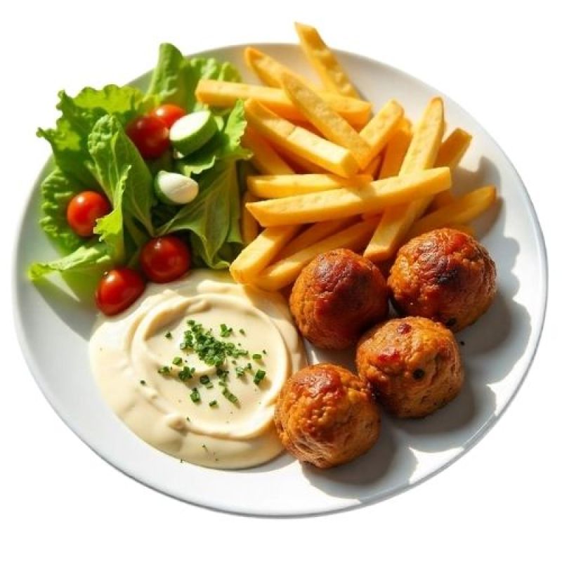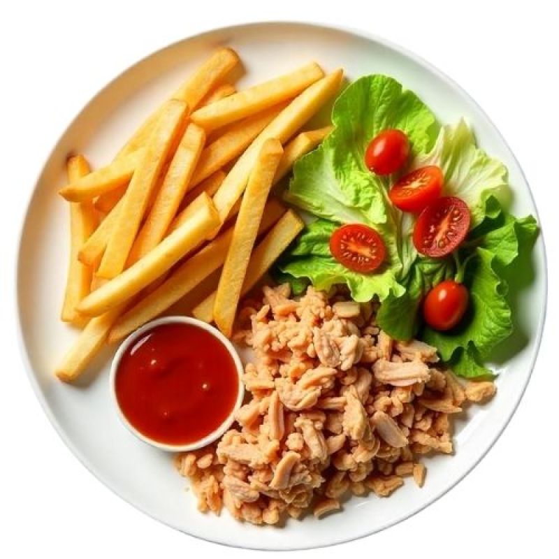 Reis oder Pommes, Salat, Saucen und Hähnchenbrust